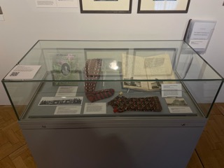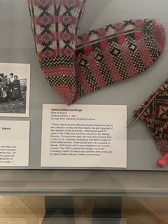 Photos of the exhibition cases showing previously unseen stockings samples from the Highland Home Industries collection of Vanishingscotland.