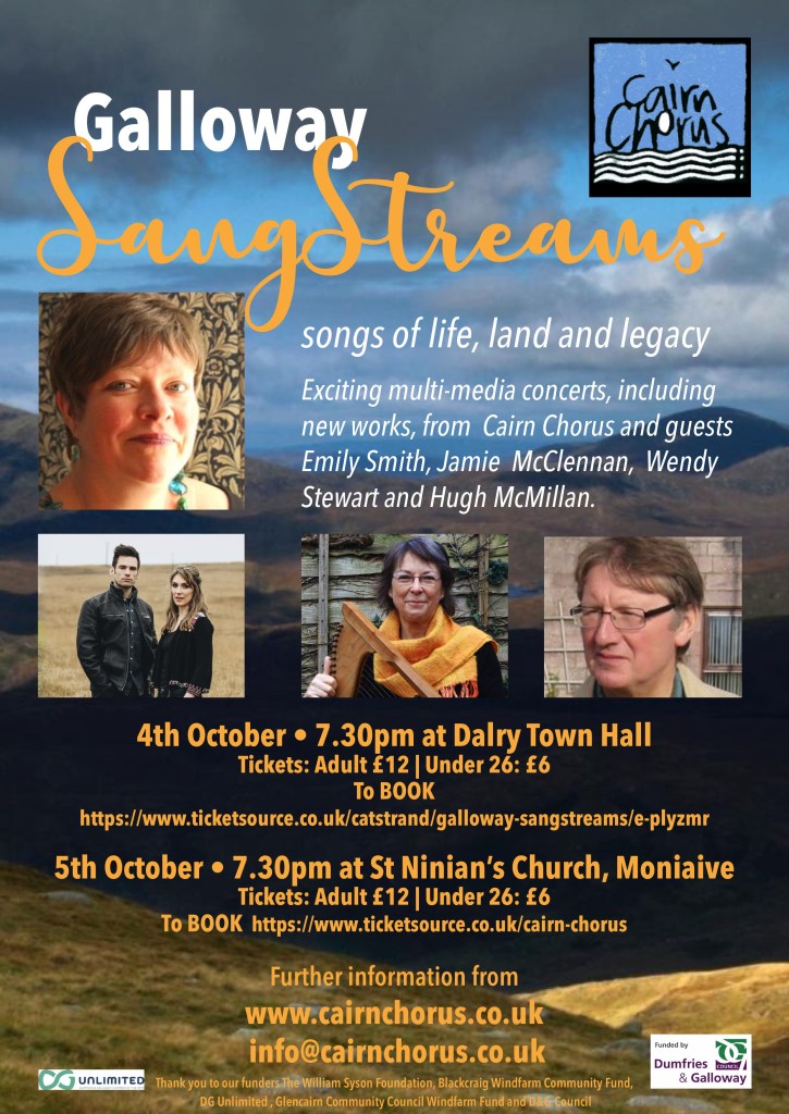 | After our sell-out concerts in May, you have another chance to catch our moving, multi-media performance in October May audience comments: “Wonderful original pieces, beautifully sung. Well balanced sound of choir and orchestra. Great variation of choir/soloists/poems and visuals. Excellent performance. I liked the plant music very much too!” “Loved it from start to finish. Loved the photos behind the choir. Loved the spoken word set to music. And hearing Emily and Jamie along with the choir.” To book Dalry: https://www.ticketsource.co.uk/catstrand/galloway-sangstreams/e-plyzmr To book Moniaive: https://www.ticketsource.co.uk/cairn-chorus |